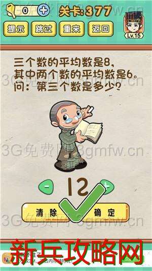 三个数的平均数是8,其中两个数的平均数是6,第三个数是多少是《脑力达人全民烧脑游戏》第377关的问题,很多网友不知道答案是什么,下面小编给大家带来脑力达人全民烧脑游戏第377关攻略。