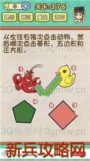 脑力达人全民烧脑游戏第376关【从左往右依次点击动物然后顺次点击菱形五边形和正方形】怎么过攻略答案