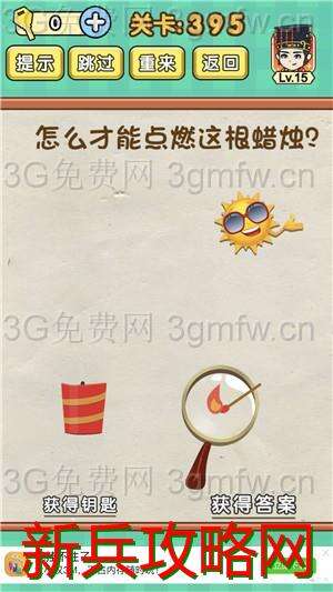 怎么才能点燃这根蜡烛是《脑力达人全民烧脑游戏》第395关的问题,很多网友不知道答案是什么,下面小编给大家带来脑力达人全民烧脑游戏第395关攻略。