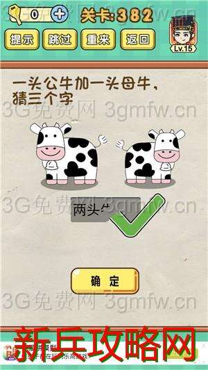 脑力达人全民烧脑游戏第382关【一头公牛加一头母牛猜三个字】怎么过攻略答案