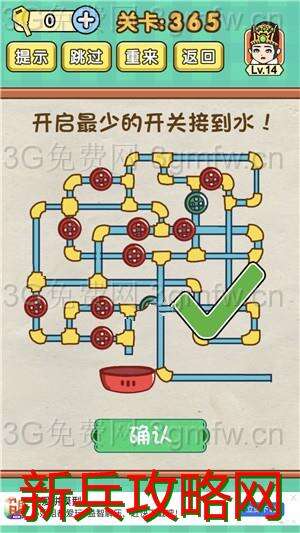 脑力达人全民烧脑游戏第365关【开启最少的开关接到水】怎么过攻略答案,第365关 开启最少的开关接到水 脑力达人全民烧脑游戏