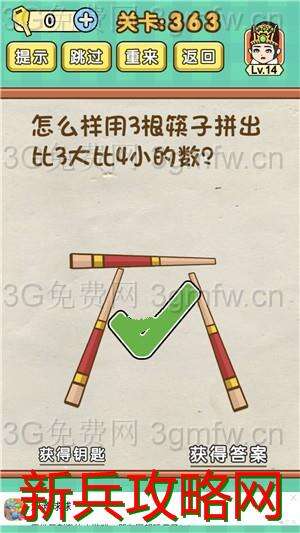 脑力达人全民烧脑游戏第363关【怎么样用3根筷子拼出比3大比4小的数】怎么过攻略答案