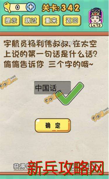 脑力达人全民烧脑游戏第342关【宇航员杨利伟叔叔在太空上说的第一句话是什么】怎么过攻略答案