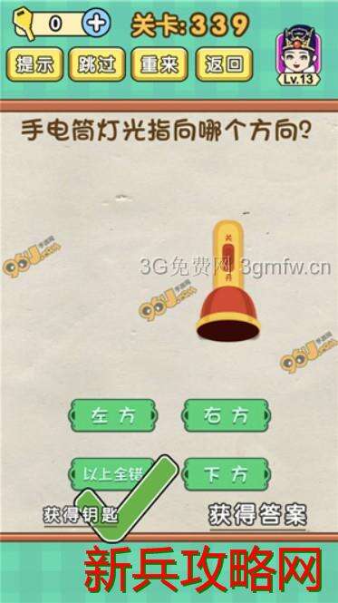 脑力达人全民烧脑游戏第339关【手电筒灯光指向哪个方向】怎么过攻略答案,第339关 手电筒灯光指向哪个方向 脑力达人全民烧脑游戏