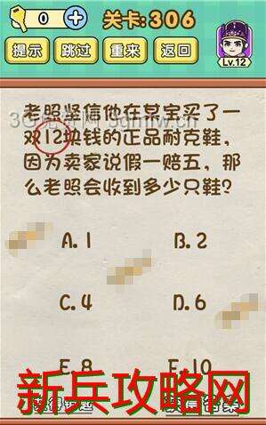 脑力达人全民烧脑游戏第306关【老照坚信他在某宝买了一双12块钱的正品耐克鞋因为卖家说假一赔五那么老照会收到多少只鞋】怎么过攻略答案
