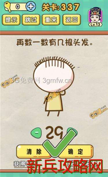 脑力达人全民烧脑游戏第337关【再数一数有几根头发】怎么过攻略答案,第337关 再数一数有几根头发 脑力达人全民烧脑游戏