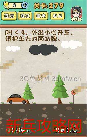 脑力达人全民烧脑游戏第279关【ph<4外出小心开车请把车去对面站牌】怎么过攻略答案
