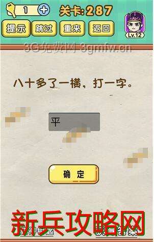 八十多了一横打一字是《脑力达人全民烧脑游戏》第287关的问题,很多网友不知道答案是什么,下面小编给大家带来脑力达人全民烧脑游戏第287关攻略。