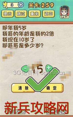 脑力达人全民烧脑游戏第259关【那年我5岁我哥的年龄是我的2倍我现在10岁了那哥哥是多少岁】怎么过攻略答案