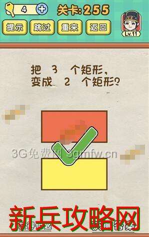 把2个矩形变成3个矩形是《脑力达人全民烧脑游戏》第255关的问题,很多网友不知道答案是什么,下面小编给大家带来脑力达人全民烧脑游戏第255关攻略。