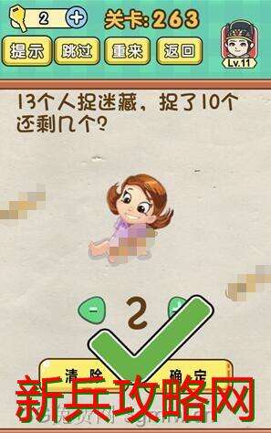 时间:2020-02-04 13:11:00 来源:新兵攻略网 阅读:脑力达人全民烧脑游戏第263关【13个人捉迷藏捉了10个还剩几个】怎么过攻略答案,第263关 13个人捉迷藏捉了10个还剩几个 脑力达人全民烧脑游戏