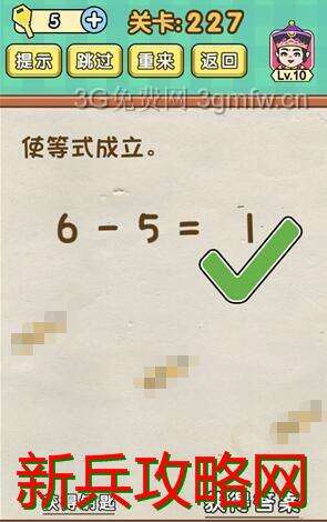 脑力达人全民烧脑游戏第227关【使等式成立】怎么过攻略答案,第227关 使等式成立 脑力达人全民烧脑游戏