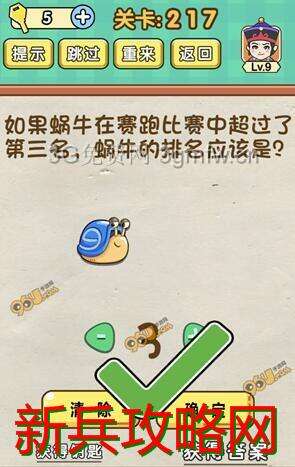 脑力达人全民烧脑游戏第217关【如果蜗牛在赛跑比赛中超过了第三名蜗牛的排名应该是】怎么过攻略答案