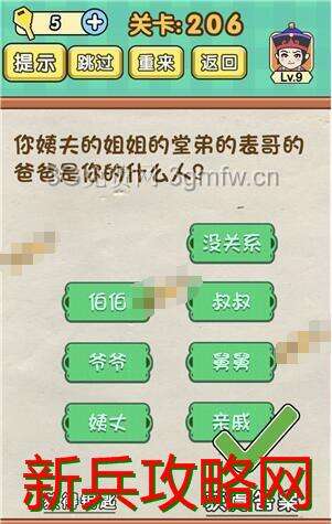 脑力达人全民烧脑游戏第206关【你姨夫的姐姐的堂弟的表哥的爸爸是你的什么人】怎么过攻略答案