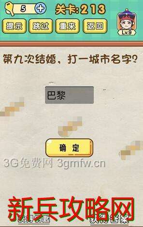 脑力达人全民烧脑游戏第213关【第九次结婚打一城市名字】怎么过攻略答案,第213关 第九次结婚打一城市名字 脑力达人全民烧脑游戏
