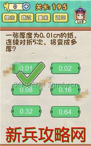 一张厚度为0.0lcm的纸连续对折5次将变成多厚是《脑力达人全民烧脑游戏》第195关的问题,很多网友不知道答案是什么,下面小编给大家带来脑力达人全民烧脑游戏第195关攻略。