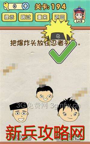 脑力达人全民烧脑游戏第194关【把爆炸头放在忍者头上】怎么过攻略答案,第194关 脑力达人全民烧脑游戏 把爆炸头放在忍者头上