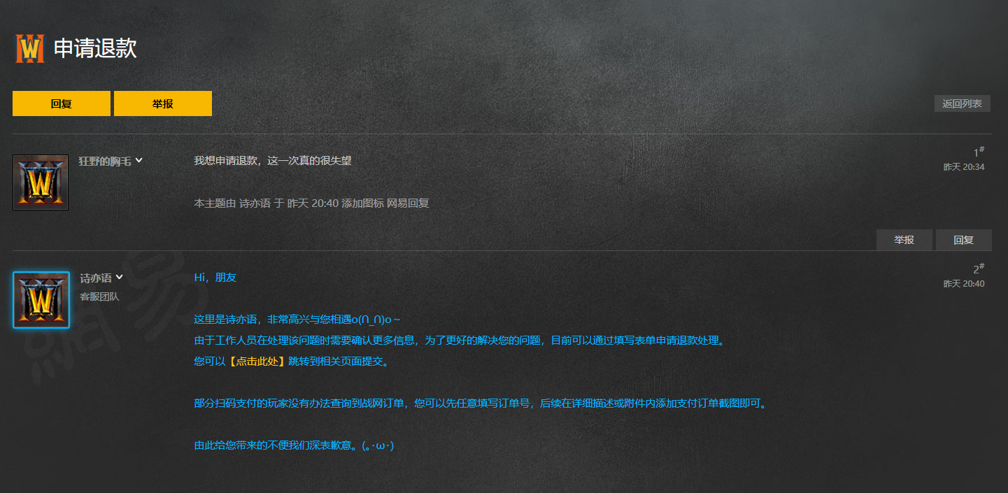 目前《魔兽争霸3:重制版》中文官网论坛中有大量网友要求退款,官方客服统一回复如下: