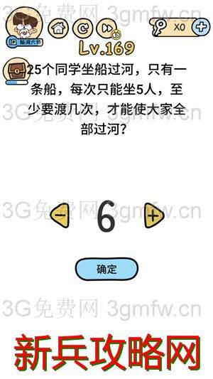 25个同学坐船过河,只有一条船,每次只能坐5人,至少要渡几次,才能使大家全部过河是脑洞大大大第169关的问题,很多玩家还不知道怎么过答案是什么,为了让大家快速通关,小编带来了脑洞大大大第169关攻略。