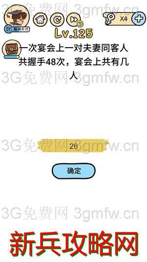脑洞大大大第125关【一次宴会上一对夫妻同客人握手48次宴会上共有几人】攻略答案
