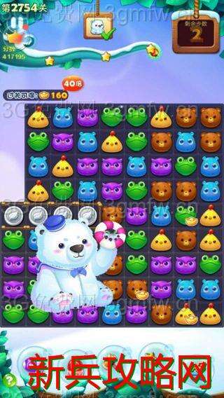 开心消消乐2754关卡一次过关。买+3步,开始组魔力鸟,打爆鸡蛋出小黄鸡,鸟加特效互换,3只大雪熊很快收集到。剩下21步,只差左下角雪块覆盖的一只大雪熊。步数充足,直接消除雪块,抵近着雪块消除,一只小黄鸡爆炸特效组成,大雪熊慢慢露出。感觉太爽了,第一次有这么多步数消除几块雪块。收集到最后一只大雪熊,剩下2步过关。