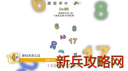 其实很简单,我们只需按照顺序从1开始点,依次点击6 8 2 20 17 60,最后点击题目旁边的33即可过关,题目旁边的33是最后点击的,很多小伙伴第一下就点了所以才过不了关。