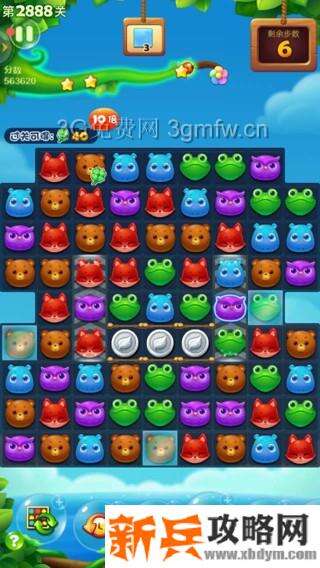开心消消乐2888关卡裸过关。这关玩了很多次,都是差20几块雪块无法消除掉,没步数了。想了一下,左右边的两门大炮,没什么用,只要消除萌豆,墨鱼特效即可让大炮消失。还是消除底部的一大堆雪块,尽可能组成魔力鸟和直线特效或横向特效互换。这次 ,打爆花藤,消除完药水瓶,顺带了横向特效和爆炸特效,底部的一堆雪块变成白色,有机会组成了魔力鸟和栗熊横向特效,心情很高兴,终于有机会过关了。互换鸟加特效,再移动3步消除完雪块,剩下4步过关。