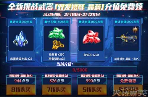 充值累积达到5000点券时,除了获得共武器升级水晶×25、250绿钻石和25军备钥匙、250血钻石的额外奖励外,还可以免费获得永久双发短弩-晶蓝!