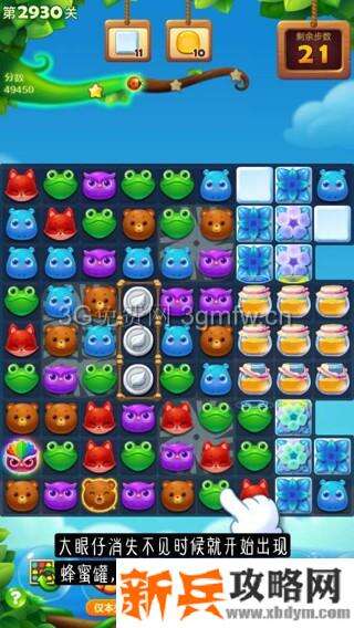 难点解析,右边雪块有的超过4层,而且在墨鱼赶走消灭打眼仔时候才出现蜂蜜罐,大大导致步数紧张,所以这关很难收尾。