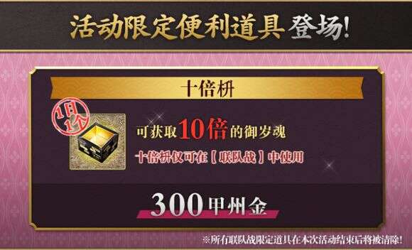 在确认出阵前,若审神者选择使用便利道具【三倍枡】,则本轮出阵结束后将获得三倍的【御岁魂】;若审神者选择使用本次联队战新增便利道具【十倍枡】,则本轮出阵结束后将获得十倍的【御岁魂】。