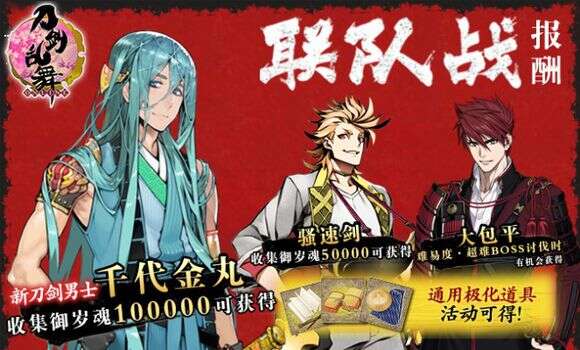 活动期间参与联队战,收集【御岁魂】,可获得对应奖励,包括极化道具和新刀剑男士。收集【御岁魂】数量达到10000,可获得【大太刀·萤丸】;收集【御岁魂】数量达到50000,可获得【太刀·骚速剑】;收集【御岁魂】数量达100000,可获得新刀剑男士【太刀·千代金丸】;累计收集【御岁魂】数量达150000,总共可获得三套通用极化道具。击破【难易度·超难】BOSS点,还有机会获得【太刀·大包平】。