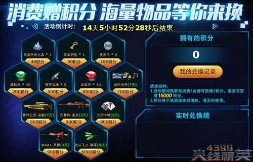 活动期间玩家的所有消费都将额外获得积分,以一点券对应1积分的方式记录在该界面(上限15000分)。拥有积分的精英们可以随意兑换界面左侧展示出的商品道具。兑换成功后会抵消相应的积分。