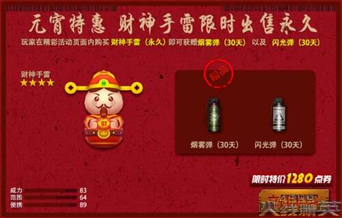 以古东方文明中的金镶红为主题设计的财神手雷。将传统节日人物财神融入设计精心制作。只在元宵节日期间限定发售。武器独享专属爆炸特效,更有四星级优秀武器属性。是良宵佳节里必备的武器。限时永久只需1280点券,附赠烟雾弹、闪光弹30天!