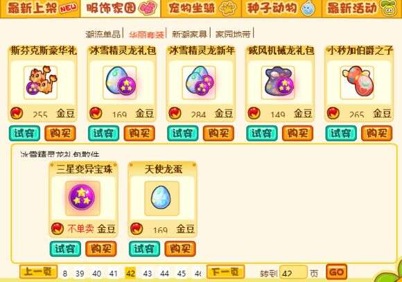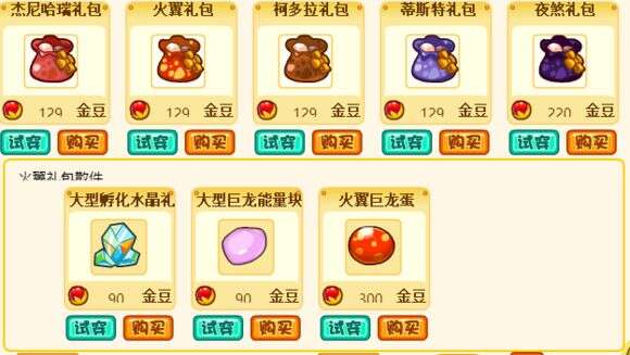 商城中有两个礼包,一个是一个是169金豆——一颗三星变异宝珠(目的是让天使龙蛋能百分之百发育成天使精灵龙)和一颗天使龙蛋;另一个是284金豆——double份(这是为进化成雪麒麟准备的,现在没有所以不用买)
