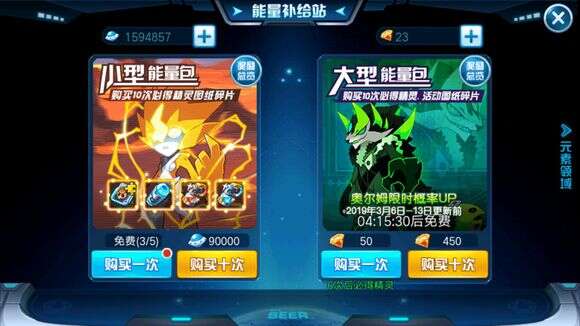 4.“能源补给站”,也就是我们所说的蛋池,左边免费(不建议那豆子抽,每天五次免费机会),右边钻石付费(单抽每48小时免费一次),赞钻党勿入,土豪随意