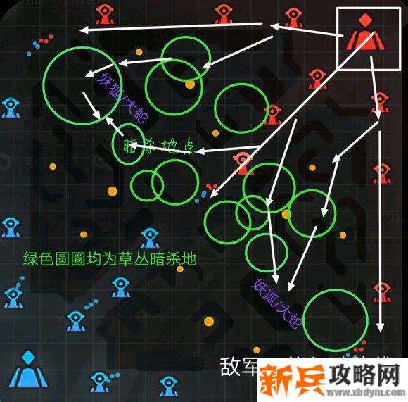 如上图所示,大蛇的刷新点有两个,但是大部分的时候大蛇都会在上路野区,而这个解决方法重点就在大蛇身上。