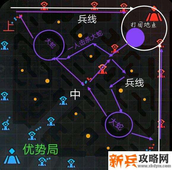 而在大蛇buff消失之前,重点是拥有大蛇buff的队友,以及未赶到战场的兵线,这两点是方案一取胜的核心,保护大蛇buff以及兵线。