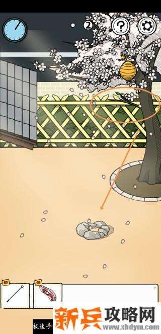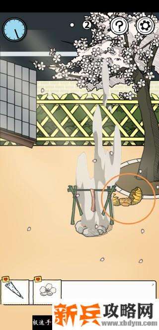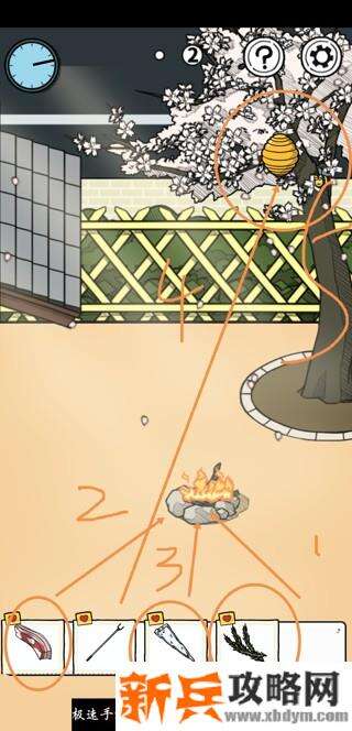 1.晾衣杆和肉拿起来,去第二页把树枝拿下来放石坑里。