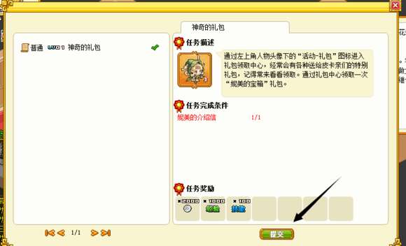 首先我们先点戴着帽子的镇长花朵提交任务。他的任务是要一封信,我们之前礼包兑换就已经送了,可以直接提交。
