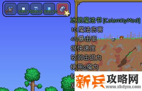 而如果前期你找到了书架亦或是到地牢门口挖了几本书做了书架,你还可以选择用冰块、雪块、寒颤棘、水桶做一本冰箭魔法书,效果比冰坠好使很多