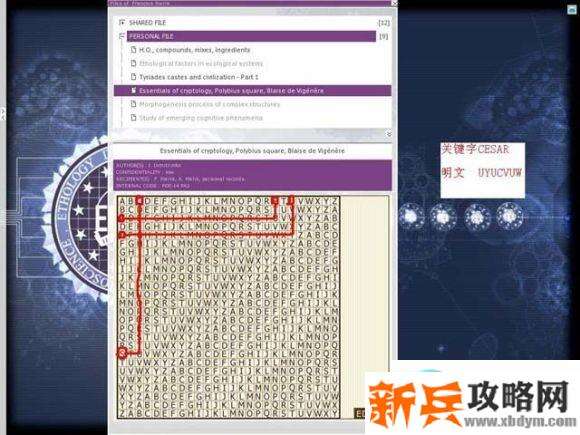 在UD14触发剧情并看到奇怪植物。从UD17进UD16,在这里找到第一种成分,并得到F.Pierre的登录密码,查看档案,得到这间房子里冷柜的密码310005B。用文件提到的加密方法得到加密文件密码Polybe,但是行不通,我就猜测用Polybius替换,果然可以打开文件。