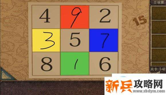 第二步:根据墙上提示九宫格相加等于15,得出右边抽屉密码为9371,得到钥匙