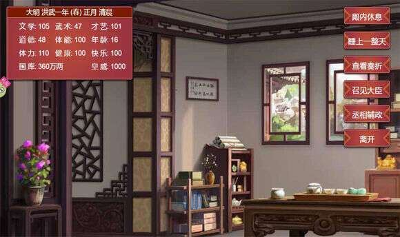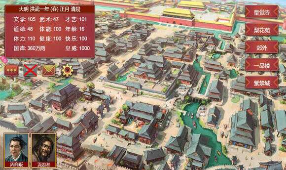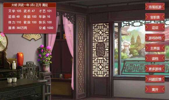 浩荡巡游:有概率遇到妃子可以选择带不带回宫,民心和治安太低会遇到刺客,侍卫和你的武力决定了你能够活下来。