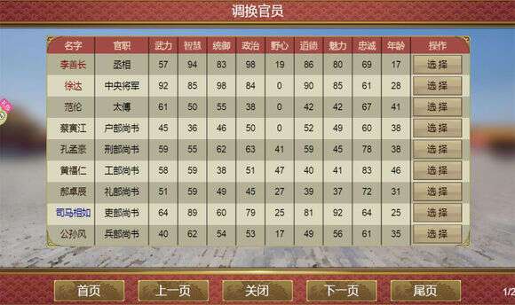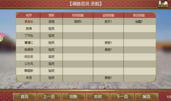 中央官员很重要,尤其是丞相、吏部尚书、工部尚书,这几个有名臣可以换的尽快换掉,其他官员都可以暂缓,甚至礼部尚书你几乎都可以无视。至于第二页那两个官职就无所谓了,纯粹摆设。后期你可以用野心高、道德低、能力也不是特别高的名臣去当。