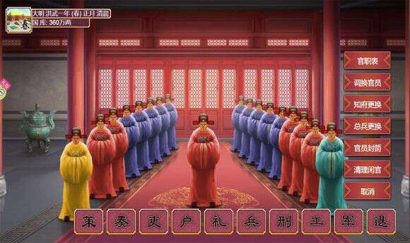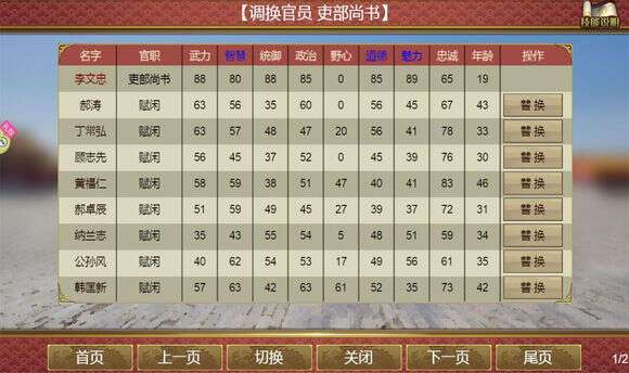 调换中央官员,其中优先换掉礼部尚书。上面属性一栏的蓝色部分表示这个职位和那几个属性挂钩,臣子名字部分,红色是近臣、蓝色是名臣、紫(粉)色是外戚。