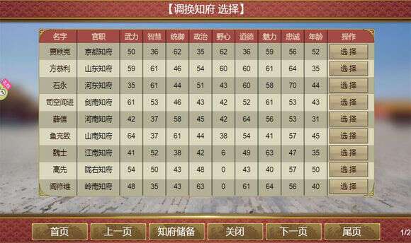 影响知府的事智慧、政治、道德、魅力,但是首先要保证他的野心低于他的忠诚,如果野心大于忠诚,就有可能造反。所以你一开始就要把野心高的知府换掉,其次再换道德低的。智慧、政治、道德最好都是60+