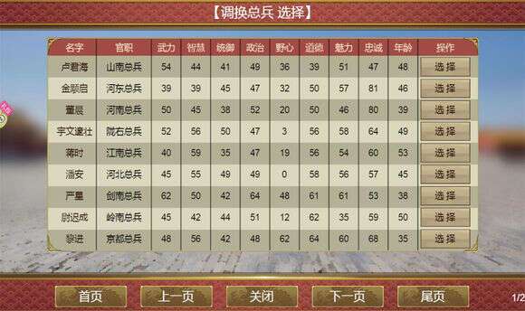 总兵不会造反,所以不懂担心野心问题,因此优先替换道德低的,武力、统御、道德最好都是60+(智慧也是越高越好)