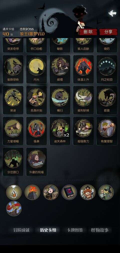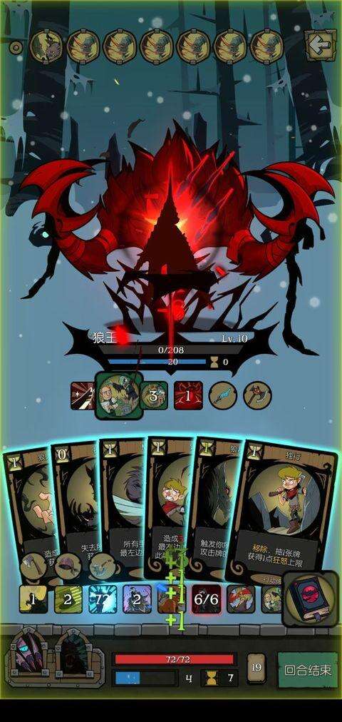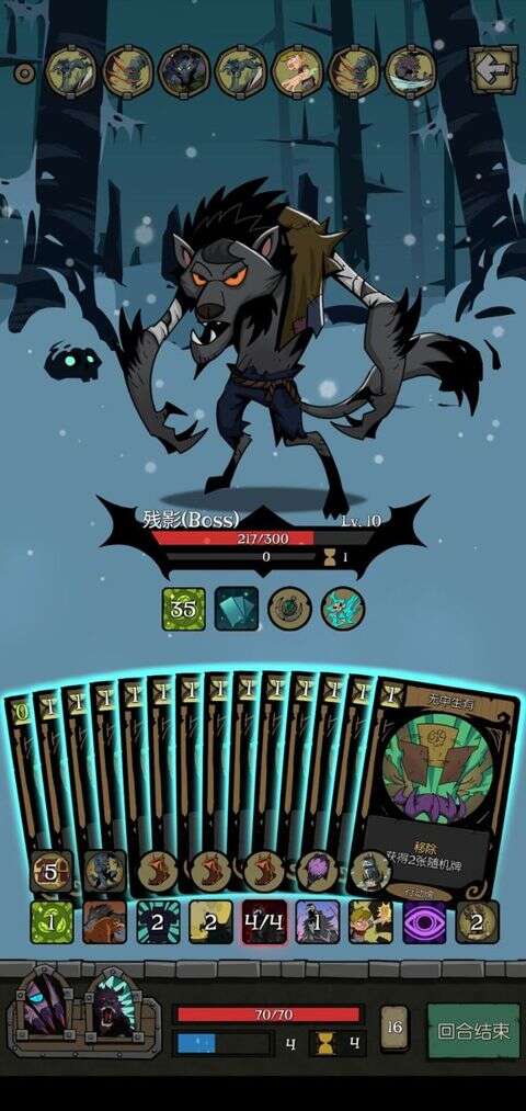 通关思路:前期保好小命上好BUFF,什么双选啦,月光啦,强袭啦,尽可能地增加行动力和过牌,以及消耗各类关键的攻击牌,有些不是消耗类攻击牌的想办法变成消耗的(虚晃或者危急时刻、迷失森林变出来),起飞后就各种狼群呼唤就行了一张狼群呼唤四十多张牌,三张狼群呼唤boss有多少血都不够杀的