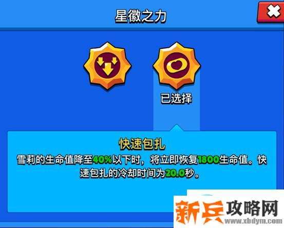 雪莉的生命值降至40%以下时,将立即回复1800生命值,该效果的冷却时间为20秒。快速包扎将帮助雪莉在与敌人交战时更加游刃有余。