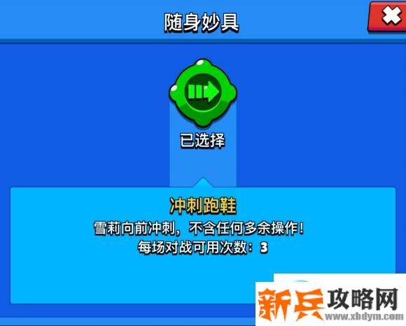 雪梨的妙具(也就是我们通常说的“绿辉”),使用后会朝着移动键的方向向前滑行,没有任何的伤害,只是单纯的一个位移技能,位移距离较短,是追击逃跑必备良技,每场对战只能使用三次。